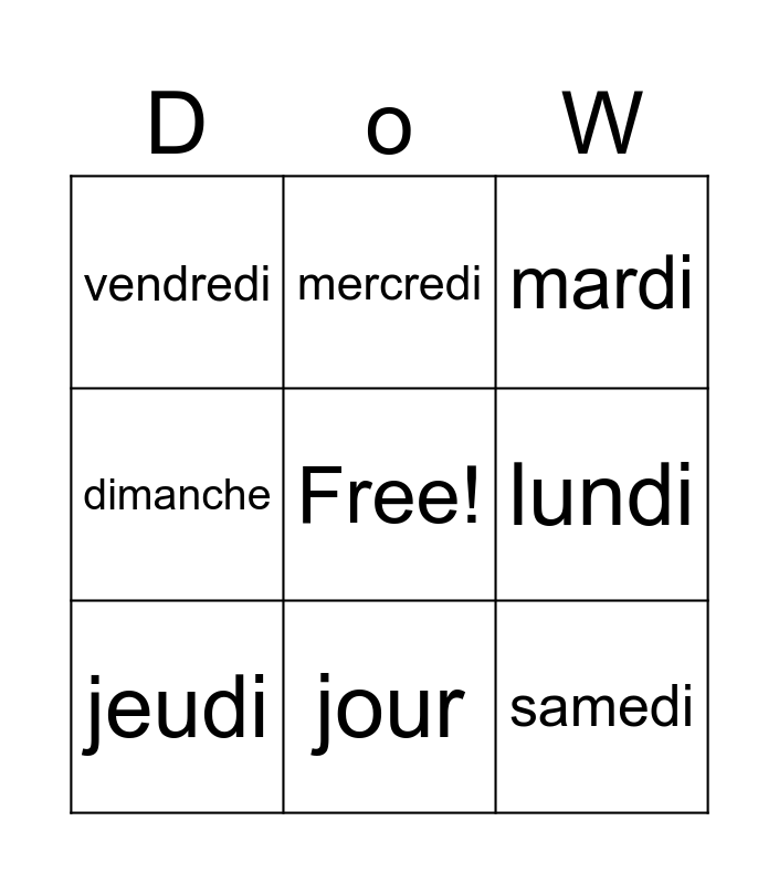 This bingo card has a free space and 8 words: lundi, mardi, mercredi, jeudi, vendredi, samedi, dimanche and jour.