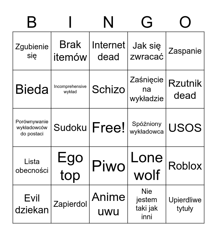This bingo card has a free space and 24 words: Ego top, Zapierdol, Schizo, Evil dziekan, Zaspanie, Zgubienie się, Bieda, Brak itemów, Spóźniony wykładowca, Piwo, Zaśnięcie na wykładzie, Porównywanie wykładowców do postaci, Lone wolf, Roblox, Incomprehensive wykład, Nie jestem taki jak inni, USOS, Internet dead, Rzutnik dead, Sudoku, Upierdliwe tytuły, Lista obecności, Jak się zwracać and Anime uwu.