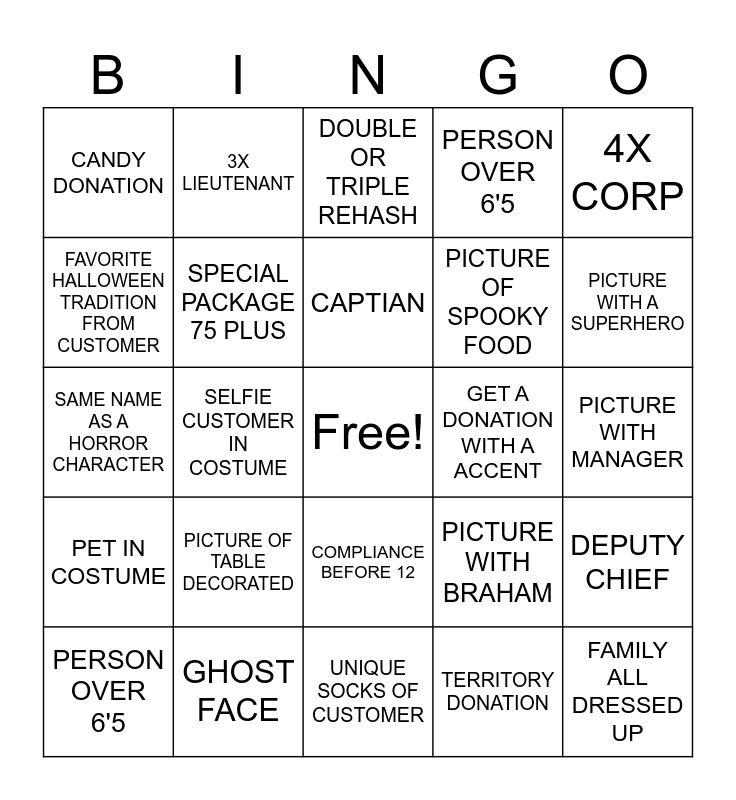 This bingo card has a free space and 24 words: PICTURE OF TABLE DECORATED, GHOST FACE, CAPTIAN, PERSON OVER 6'5, 4X CORP, CANDY DONATION, FAVORITE HALLOWEEN TRADITION FROM CUSTOMER, 3X LIEUTENANT, GET A DONATION WITH A ACCENT, COMPLIANCE BEFORE 12, PICTURE OF SPOOKY FOOD, SAME NAME AS A HORROR CHARACTER, PICTURE WITH BRAHAM, DEPUTY CHIEF, SPECIAL PACKAGE 75 PLUS, TERRITORY DONATION, PICTURE WITH MANAGER, DOUBLE OR TRIPLE REHASH, PICTURE WITH A SUPERHERO, SELFIE CUSTOMER IN COSTUME, FAMILY ALL DRESSED UP, PET IN COSTUME, PERSON OVER 6'5 and UNIQUE SOCKS OF CUSTOMER.