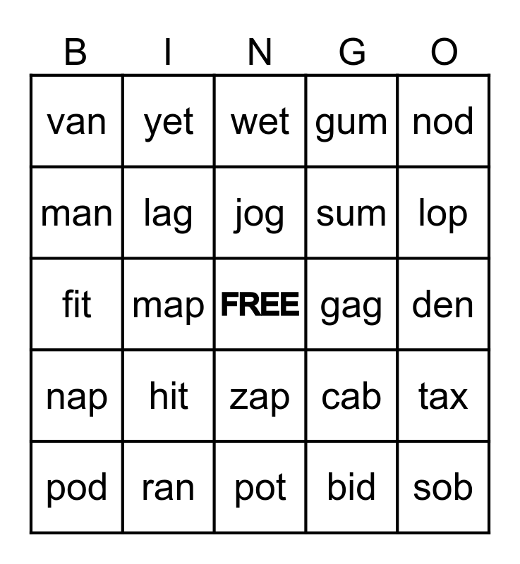 This bingo card has a free space and 24 words: hit, ran, jog, pod, nod, van, man, yet, gag, zap, sum, fit, cab, tax, lag, bid, den, wet, lop, map, sob, nap, gum and pot.