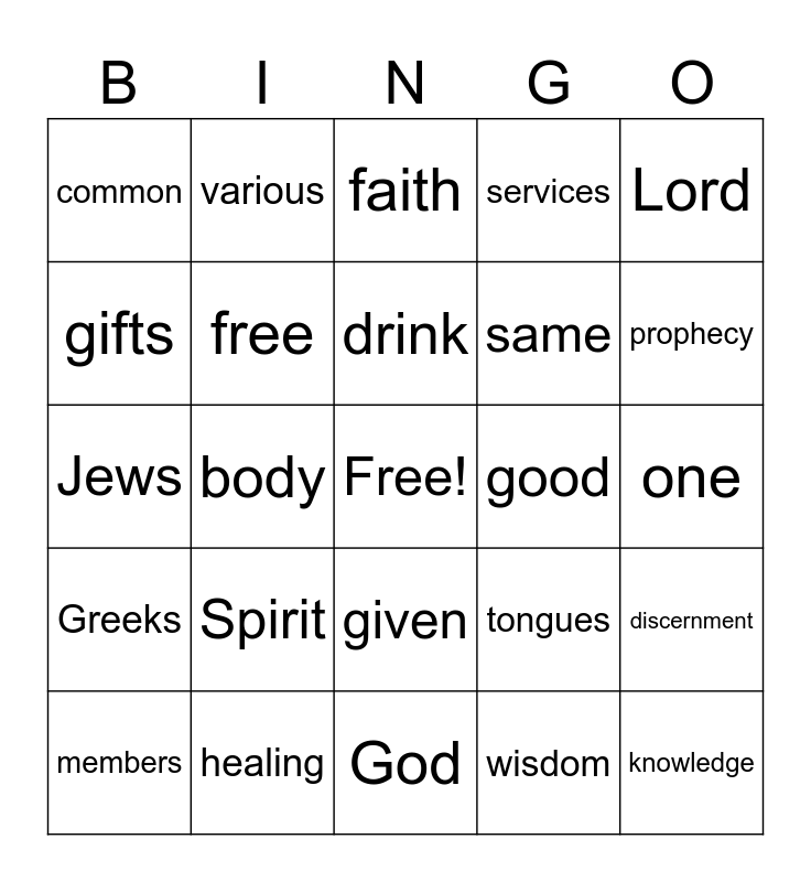 This bingo card has a free space and 24 words: Spirit, healing, drink, members, Lord, common, gifts, various, good, given, same, Jews, tongues, discernment, free, wisdom, one, faith, prophecy, body, knowledge, Greeks, services and God.