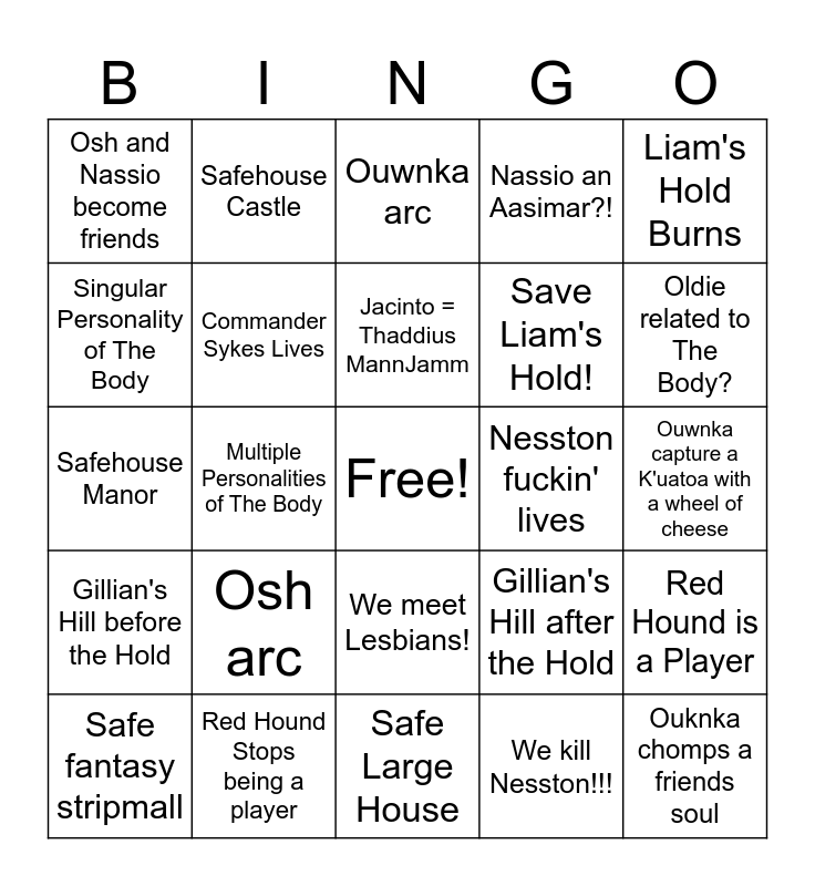 This bingo card has a free space and 36 words: Cerephen arc, Cerephen Makes Rollins a Fursuit, Commander Sykes Dies, Commander Sykes Lives, Gillian's Hill after the Hold, Gillian's Hill before the Hold, Jacinto = Thaddius MannJamm, Jacinto arc, Liam's Hold Burns, Meet a Follower of Shar, Multiple Personalities of The Body, Nassio an Aasimar?!, Nassio gets a mom!, Nesston fuckin' lives, Oldie related to The Body?, Osh and Nassio become friends, Osh and Nassio continue fighting, Osh arc, Ouknka chomps a friends soul, Ouwnka arc, Ouwnka capture a K'uatoa with a wheel of cheese, Red Hound is a Player, Red Hound Stops being a player, Safe fantasy stripmall, Safe Large House, Safehouse Castle, Safehouse Manor, Safehouse tavern/inn, Save Liam's Hold!, Singular Personality of The Body, Something from time corridor, There are still no lesbians :(, We kill Nesston!!!, We meet Lesbians!, Zolbi Dies and Zolbi Lives.