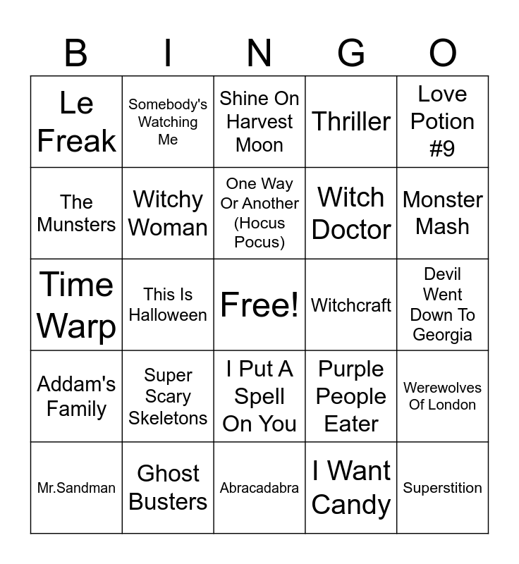 This bingo card has a free space and 24 words: Super Scary Skeletons, Ghost Busters, One Way Or Another (Hocus Pocus), Mr.Sandman, Love Potion #9, Le Freak, The Munsters, Somebody's Watching Me, Witchcraft, I Put A Spell On You, Witch Doctor, Time Warp, Purple People Eater, Werewolves Of London, Witchy Woman, I Want Candy, Devil Went Down To Georgia, Shine On Harvest Moon, Monster Mash, This Is Halloween, Superstition, Addam's Family, Thriller and Abracadabra.