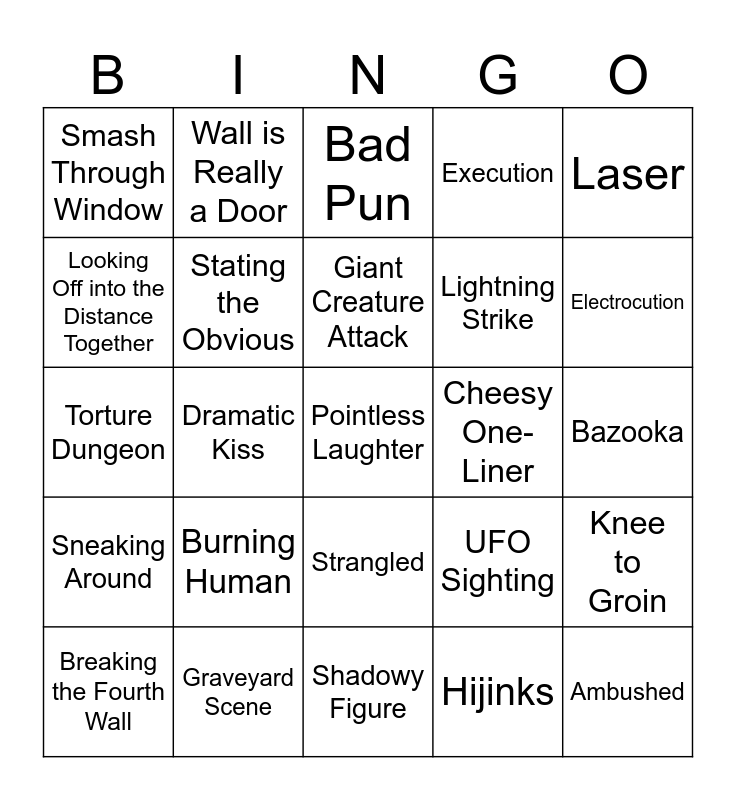 This bingo card has 28 words: Knee to Groin, Impaled, Lightning Strike, Hijinks, Looking Off into the Distance Together, Bad Pun, Wall is Really a Door, Sneaking Around, Cheesy One-Liner, Breaking the Fourth Wall, Torture Dungeon, Execution, Graveyard Scene, Shadowy Figure, Electrocution, Hero Meltdown, Burning Human, Stating the Obvious, Giant Creature Attack, Strangled, Smash Through Window, Ambushed, Pointless Laughter, Dramatic Kiss, Bazooka, UFO Sighting, Laser and Car Chase.