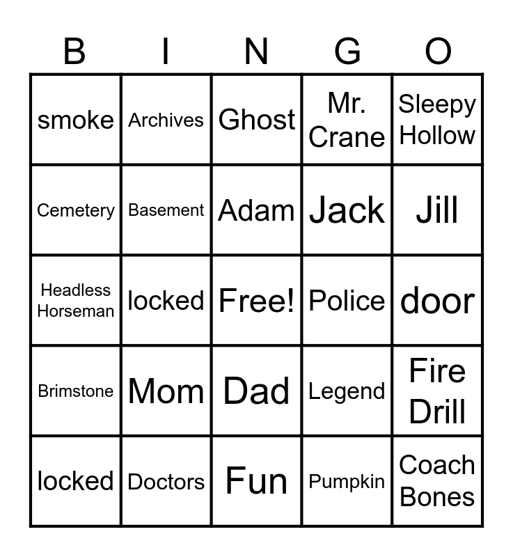 This bingo card has a free space and 24 words: Mom, Doctors, Adam, locked, Sleepy Hollow, smoke, Cemetery, Archives, Police, Dad, Jack, Headless Horseman, Legend, Fire Drill, Basement, Pumpkin, door, Ghost, Jill, locked, Coach Bones, Brimstone, Mr. Crane and Fun.