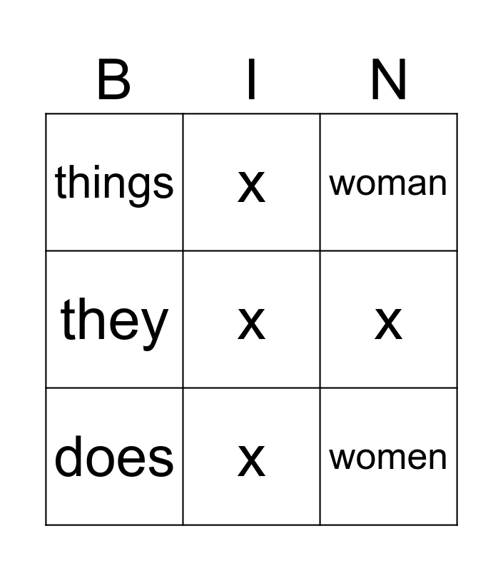 This bingo card has a free space and 8 words: x, woman, x, does, things, women, they and x.