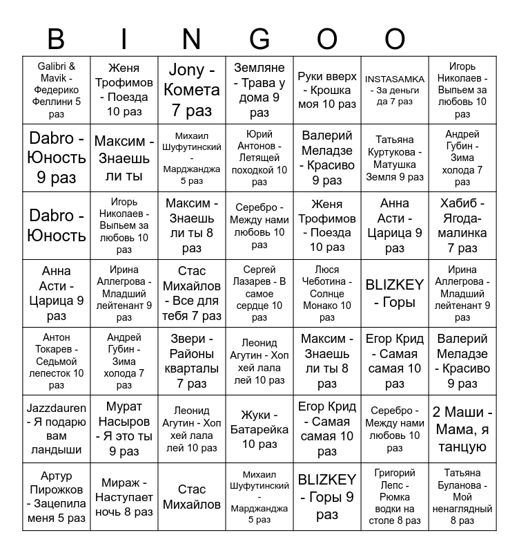 This bingo card has 142 words: Серебро - Между нами любовь 10 раз, Анна Асти - Царица 9 раз, Люся Чеботина - Солнце Монако 10 раз, Григорий Лепс - Рюмка водки на столе 8 раз, Валерий Меладзе - Красиво 9 раз, Женя Трофимов - Поезда 10 раз, Артур Пирожков - Зацепила меня 5 раз, Андрей Губин - Ночь 10 раз, INSTASAMKA - За деньги да 7 раз, BLIZKEY - Горы 9 раз, Хабиб - Ягода-малинка 7 раз, Dabro - Юность 9 раз, Jazzdauren - Я подарю вам ландыши 7 раз, Артик и Асти - Грустный Денс 10 раз, Валентин Стрыкало - Наше лето 5 раз, Ласковый май - Седая ночь 10 раз, Максим - Знаешь ли ты 8 раз, 2 Маши - Мама, я танцую 10 раз, Стас Михайлов - Все для тебя 7 раз, Руки вверх - Крошка моя 10 раз, Серебро - Между нами любовь 10 раз, Анна Асти - Царица 9 раз, Люся Чеботина - Солнце Монако 10 раз, Григорий Лепс - Рюмка водки на столе 8 раз, Сергей Лазарев - В самое сердце 10 раз, Валерий Меладзе - Красиво 9 раз, Женя Трофимов - Поезда 10 раз, Артур Пирожков - Зацепила меня 5 раз, Андрей Губин - Ночь 10 раз, INSTASAMKA - За деньги, BLIZKEY - Горы, Хабиб - Ягода-малинка, 2 Маши - Мама, я танцую, Dabro - Юность, Jazzdauren - Я подарю вам ландыши, Артик и Асти - Грустный Денс, Валентин Стрыкало - Наше лето, Ласковый май - Седая ночь, Максим - Знаешь ли ты, Сергей Лазарев, Стас Михайлов, Руки вверх, Серебро - Между нами любовь 10 раз, Анна Асти - Царица 9 раз, Люся Чеботина - Солнце Монако 10 раз, Григорий Лепс - Рюмка водки на столе 8 раз, Валерий Меладзе - Красиво 9 раз, Женя Трофимов - Поезда 10 раз, Артур Пирожков - Зацепила меня 5 раз, Андрей Губин - Ночь 10 раз, INSTASAMKA - За деньги да 7 раз, BLIZKEY - Горы 9 раз, Хабиб - Ягода-малинка 7 раз, 2 Маши - Мама, я танцую 10 раз, Dabro - Юность 9 раз, Jazzdauren - Я подарю вам ландыши 7 раз, Артик и Асти - Грустный Денс 10 раз, Валентин Стрыкало - Наше лето 5 раз, Ласковый май - Седая ночь 10 раз, Максим - Знаешь ли ты 8 раз, Сергей Лазарев - В самое сердце 10 раз, Стас Михайлов - Все для тебя 7 раз, Руки вверх - Крошка моя 10 раз, Татьяна Куртукова - Матушка Земля 9 раз, Татьяна Буланова - Мой ненаглядный 8 раз, Игорь Николаев - Выпьем за любовь 10 раз, Звери - Районы кварталы 7 раз, Леприконсы - Хали-гали 10 раз, Анна Асти - По барам 7 раз, Мурат Насыров - Я это ты 9 раз, Леонид Агутин - Хоп хей лала лей 10 раз, Galibri & Mavik - Федерико Феллини 5 раз, Юрий Антонов - Летящей походкой 10 раз, Жуки - Батарейка 10 раз, Руки вверх - 18 мне уже 5 раз, Иванушки - Тополиный пух 10 раз, Катя Лель - Мой мармеладный 7 раз, Антон Токарев - Седьмой лепесток 10 раз, Земляне - Трава у дома 9 раз, Мираж - Наступает ночь 8 раз, Валерий Меладзе - Салют Вера 10 раз, Gayazovs Brothers - Малиновая лада 7 раз, Чичерина - Ту-лу-ла 10 раз, Егор Крид - Самая самая 10 раз, Михаил Шуфутинский - Марджанджа 5 раз, Султан Лагучев - Горький вкус 9 раз, Андрей Губин - Зима холода 7 раз, Jony - Комета 7 раз, Ирина Аллегрова - Младший лейтенант 9 раз, Юра Шатунов - Детство 8 раз, Шаман - Я русский 9 раз, Zdob și Zdub - Видели ночь 5 раз, Серебро - Между нами любовь 10 раз, Анна Асти - Царица 9 раз, Люся Чеботина - Солнце Монако 10 раз, Григорий Лепс - Рюмка водки на столе 8 раз, Валерий Меладзе - Красиво 9 раз, Женя Трофимов - Поезда 10 раз, Артур Пирожков - Зацепила меня 5 раз, Андрей Губин - Ночь 10 раз, INSTASAMKA - За деньги да 7 раз, BLIZKEY - Горы 9 раз, Хабиб - Ягода-малинка 7 раз, 2 Маши - Мама, я танцую 10 раз, Dabro - Юность 9 раз, Jazzdauren - Я подарю вам ландыши 7 раз, Артик и Асти - Грустный Денс 10 раз, Валентин Стрыкало - Наше лето 5 раз, Ласковый май - Седая ночь 10 раз, Максим - Знаешь ли ты 8 раз, Сергей Лазарев - В самое сердце 10 раз, Стас Михайлов - Все для тебя 7 