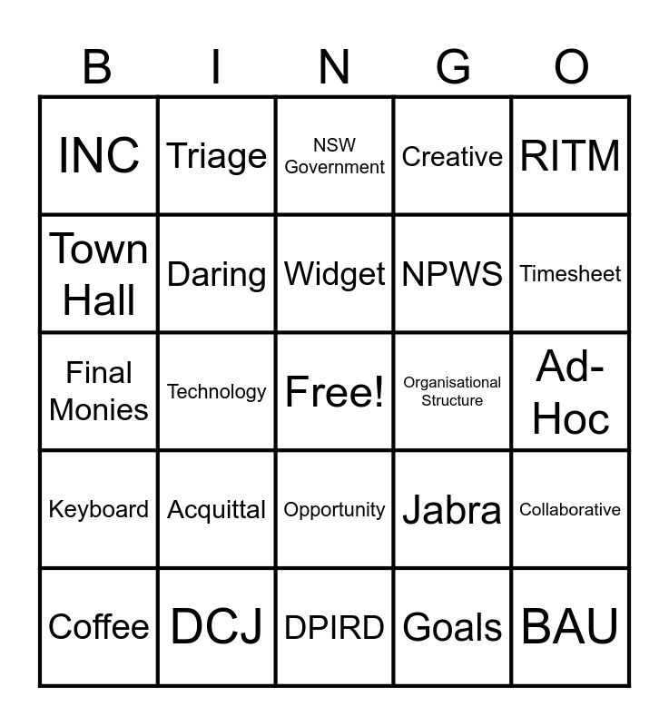 This bingo card has a free space and 97 words: Service Support, Payroll, Finance, Technology, Team Leader, Senior Support, Support Officer, Director, Executive Director, Dep Sec, Secretary, Headset, Laptop, Keyboard, Workflow, INC, RITM, FIN, HRC, Knowledge, EBR, Approver, Expense8, Genesys, Dashboard, Widget, Coffee, Collaborative, Kind, Inclusive, Daring, Creative, DPHI, DCCEEW, DPIRD, Opportunity, Onboarding, New Hire, Separation, Final Monies, LDD, Ad-Hoc, Talent Plan, Goals, Acquittal, IGA, Profile, CS Connect, Escalation, Flag, Master Data, Training, Email, MyCareer, myWorkZone, Interaction, Queue, Triage, Service Centre, Leave, Tom Chapman, Fieldglass, Hyper Care, Casual, Temporary, Full-Time, Part-Time, Assignment Group, SOPA, DCJ, NPWS, Authenticator, Email Address, Portal Form, Testing, Company Code, Cost Centre, Delegation, Organisational Structure, Request, Flex, Timesheet, WBS, Personnel Number, Role Number, Transition, BAU, Viva Engage, MS Teams, Outlook, NSW Government, Go Live, Customer Service, Jabra, Town Hall, Slido and Task.