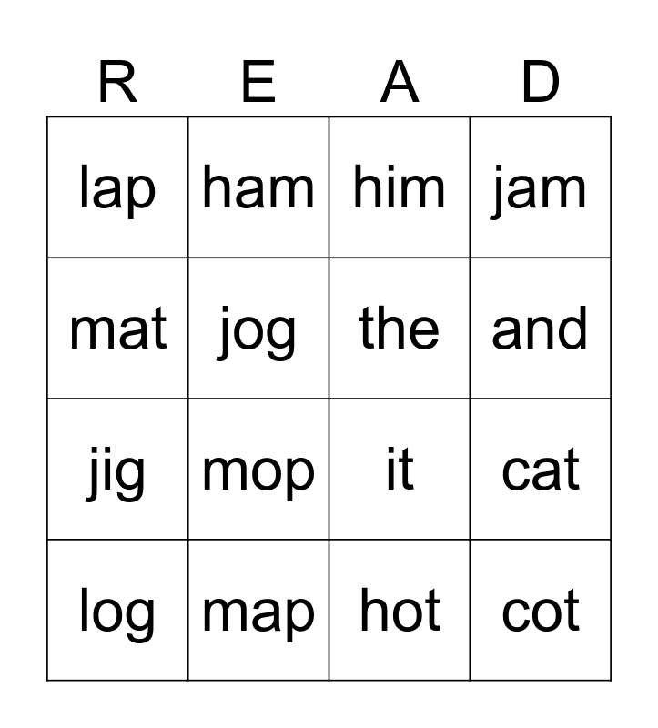 This bingo card has 37 words: I, like, to, the, of, will, and, a, mat, hat, cat, jam, log, hot, jog, cot, lit, him, cap, map, lap, mop, tap, lag, hog, tag, ham, cam, Jill, mac, tam, lam, it, gal, at, jig and mog.