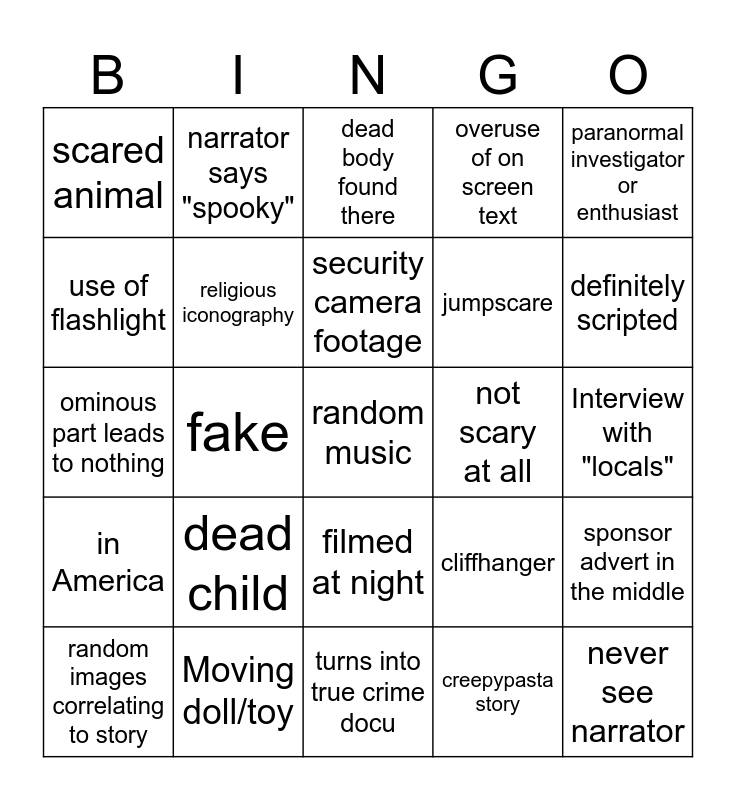 This bingo card has a free space and 24 words: dead child, Moving doll/toy, security camera footage, random images correlating to story, paranormal investigator or enthusiast, scared animal, use of flashlight, narrator says "spooky", not scary at all, filmed at night, jumpscare, ominous part leads to nothing, cliffhanger, sponsor advert in the middle, religious iconography, creepypasta story, Interview with "locals", dead body found there, definitely scripted, fake, never see narrator, in America, overuse of on screen text and turns into true crime docu.