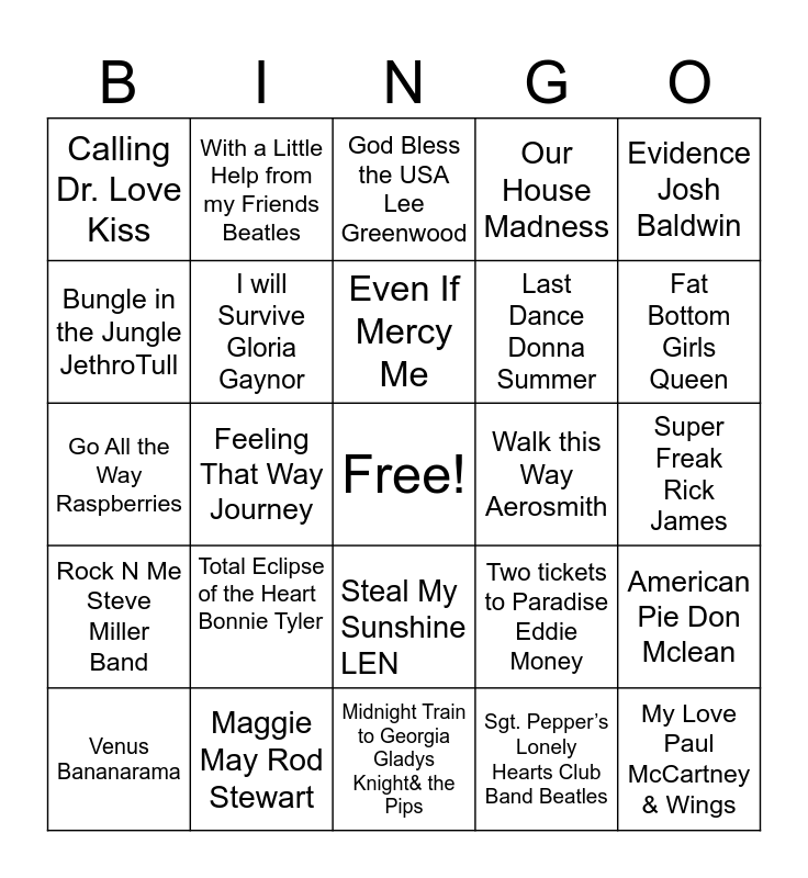 This bingo card has a free space and 24 words: Total Eclipse of the Heart Bonnie Tyler, Maggie May Rod Stewart, Even If Mercy Me, Venus Bananarama, Evidence Josh Baldwin, Calling Dr. Love Kiss, Bungle in the Jungle JethroTull, With a Little Help from my Friends Beatles, Walk this Way Aerosmith, Steal My Sunshine LEN, Last Dance Donna Summer, Go All the Way Raspberries, Two tickets to Paradise Eddie Money, American Pie Don Mclean, I will Survive Gloria Gaynor, Sgt. Pepper’s Lonely Hearts Club Band Beatles, Super Freak Rick James, God Bless the USA Lee Greenwood, Fat Bottom Girls Queen, Feeling That Way Journey, My Love Paul McCartney & Wings, Rock N Me Steve Miller Band, Our House Madness and Midnight Train to Georgia Gladys Knight& the Pips.