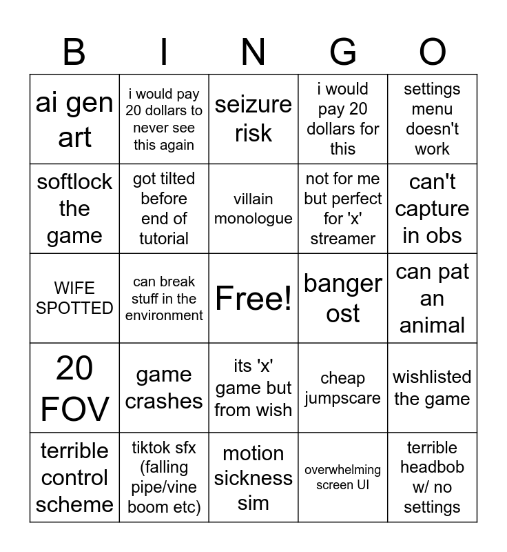 This bingo card has a free space and 29 words: terrible control scheme, bad unbalanced audio, can break stuff in the environment, cate 'qa' tests the game, ai gen art, seizure risk, got tilted before end of tutorial, game crashes, banger ost, tiktok sfx (falling pipe/vine boom etc), can pat an animal, terrible headbob w/ no settings, motion sickness sim, overwhelming screen UI, can't capture in obs, never ending character dialogue (cosy curse), its 'x' game but from wish, 20 FOV, settings menu doesn't work, WIFE SPOTTED, cheap jumpscare, developer in chat, not for me but perfect for 'x' streamer, softlock the game, i would pay 20 dollars for this, i would pay 20 dollars to never see this again, wishlisted the game, villain monologue and fishing minigame.