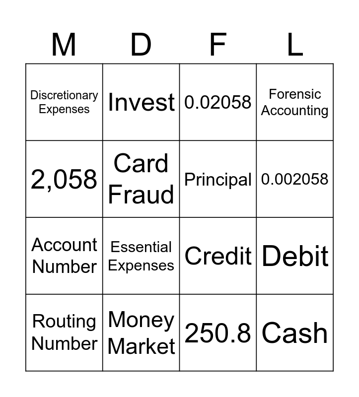 This bingo card has 16 words: Money Market, Debit, 0.02058, Discretionary Expenses, Account Number, Invest, Credit, 250.8, 2,058, Card Fraud, Routing Number, Forensic Accounting, Essential Expenses, 0.002058, Principal and Cash.