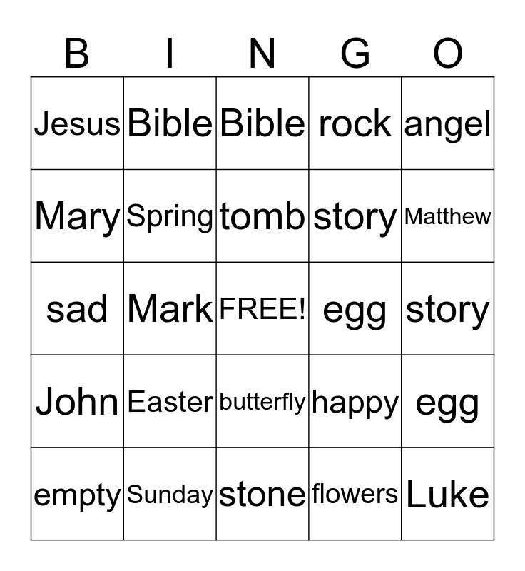This bingo card has a free space and 24 words: Easter, Sunday, tomb, empty, angel, Jesus, Mary, Bible, egg, butterfly, story, sad, happy, egg, Spring, flowers, story, Bible, Matthew, Mark, Luke, John, rock and stone.