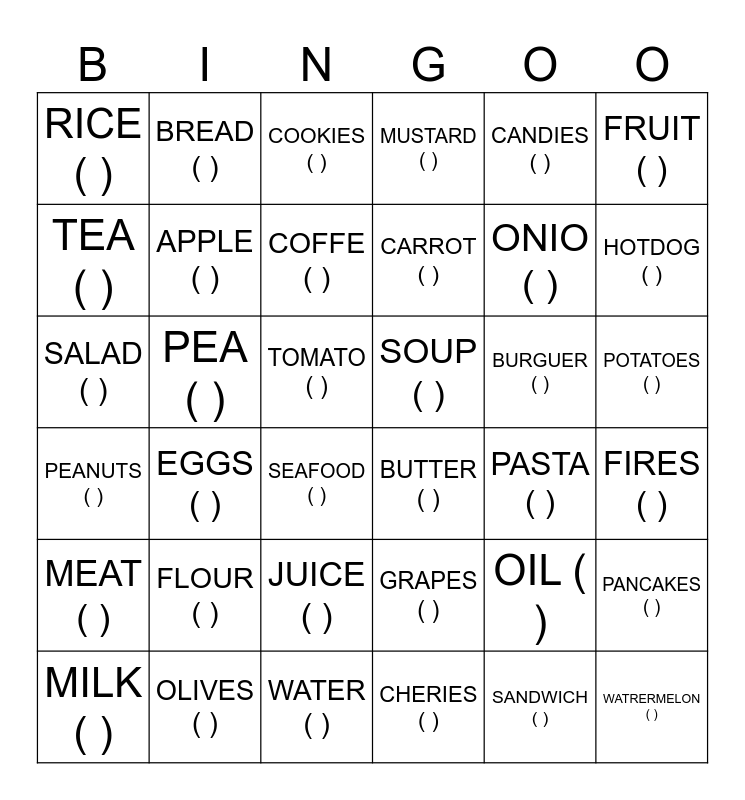 This bingo card has 42 words: SANDWICH ( ), APPLE ( ), ORANGE ( ), BURGUER ( ), FIRES ( ), EGGS ( ), SALAD ( ), VEGETABLES ( ), COOKIES ( ), POTATOES ( ), TOMATO ( ), CARROT ( ), HOTDOG ( ), CANDIES ( ), OLIVES ( ), PEANUTS ( ), PANCAKES ( ), ONIO ( ), WATRERMELON ( ), BREAD ( ), FRUIT ( ), JUICE ( ), MEAT ( ), RICE ( ), CEREAL ( ), MILK ( ), COFFE ( ), SUGAR ( ), FLOUR ( ), OIL ( ), SALT ( ), SOUP ( ), TEA ( ), PASTA ( ), WATER ( ), SEAFOOD ( ), BUTTER ( ), PEA ( ), GRAPES ( ), CHERIES ( ), MUSTARD ( ) and HONEY ().