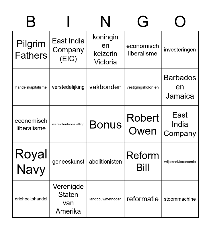 This bingo card has a free space and 47 words: spinning jenny, stoommachine, arbeidersklasse, landbouwmethoden, geneeskunst, Verenigde Oost-Indische Compagnie (VOC), East India Company (EIC), kapitalisme, handelskapitalisme, industrieel kapitalisme, verstedelijking, economisch liberalisme, vrijemarkteconomie, Reform Bill, Kinderarbeid, Factory Act, vakbonden, Robert Owen, financieel centrum, investeringen, wereldtentoonstelling, reformatie, Pilgrim Fathers, vestigingskoloniën, plantagekoloniën, Barbados en Jamaica, driehoekshandel, Royal African Company, abolitionisten, Royal Navy, natuurrechten, volkssoevereiniteit, trias politica, no taxation without representation, federale staat, Verenigde Staten van Amerika, East India Company, factorijen, Mogol-rijk, Verdrag van Allahabad, Grote Indiase Opstand, koningin en keizerin Victoria, economisch liberalisme, afzetgebied, Suezkanaal, Engelse taal, Britse rechtssysteem en onderwijs and Indian National Congress.