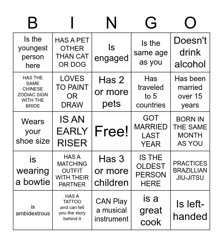 This bingo card has a free space and 24 words: HAS A MATCHING OUTFIT WITH THEIR PARTNER, HAS A TATTOO and can tell you the story behind it, Has 2 or more pets, is ambidextrous, Doesn't drink alcohol, Is the youngest person here, HAS THE SAME CHINESE ZODIAC SIGN WITH THE BRIDE, HAS A PET OTHER THAN CAT OR DOG, GOT MARRIED LAST YEAR, Has 3 or more children, Has traveled to 5 countries, Wears your shoe size, IS THE OLDEST PERSON HERE, PRACTICES BRAZILLIAN JIU-JITSU, LOVES TO PAINT OR DRAW, is a great cook, BORN IN THE SAME MONTH AS YOU, Is engaged, Has been married over 15 years, IS AN EARLY RISER, Is left-handed, is wearing a bowtie, Is the same age as you and CAN Play a musical instrument.