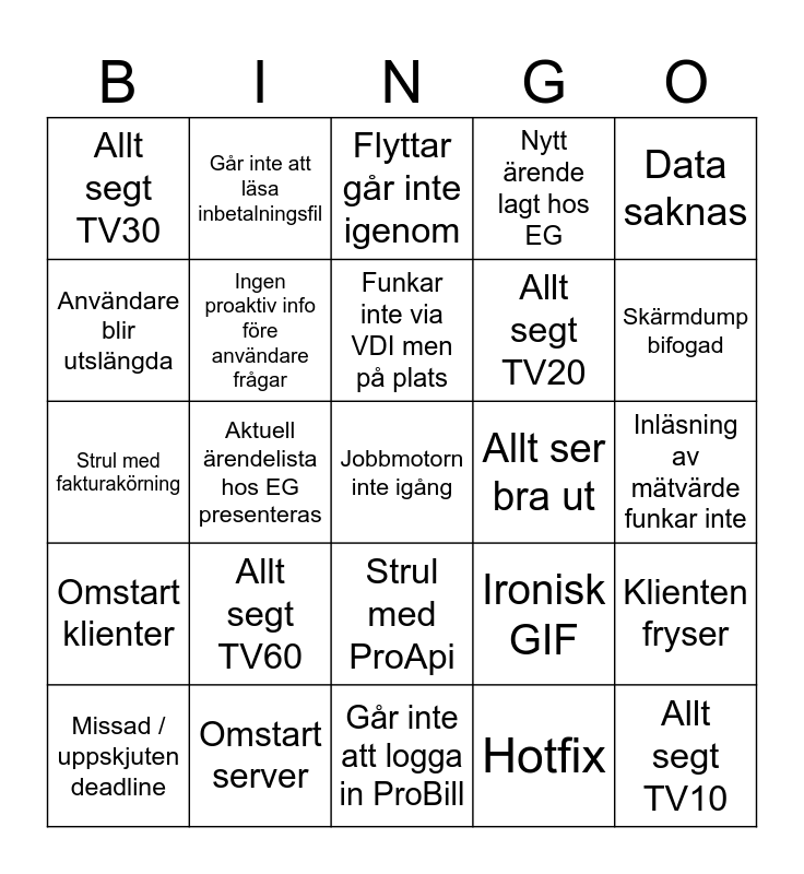 This bingo card has 25 words: Allt segt TV60, Går inte att logga in ProBill, Funkar inte via VDI men på plats, Missad / uppskjuten deadline, Data saknas, Allt segt TV30, Användare blir utslängda, Går inte att läsa inbetalningsfil, Allt ser bra ut, Strul med ProApi, Allt segt TV20, Strul med fakturakörning, Ironisk GIF, Klienten fryser, Ingen proaktiv info före användare frågar, Allt segt TV10, Inläsning av mätvärde funkar inte, Flyttar går inte igenom, Skärmdump bifogad, Aktuell ärendelista hos EG presenteras, Jobbmotorn inte igång, Omstart server, Omstart klienter, Nytt ärende lagt hos EG and Hotfix.