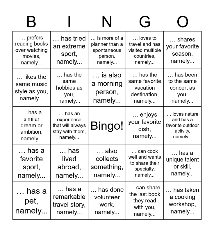 This bingo card has a free space and 24 words: … has lived abroad, namely..., … has a remarkable travel story, namely..., … is also a morning person, namely..., … has a pet, namely..., … shares your favorite season, namely..., … prefers reading books over watching movies, namely..., … likes the same music style as you, namely..., … has tried an extreme sport, namely..., … enjoys your favorite dish, namely..., … also collects something, namely..., … has the same favorite vacation destination, namely..., … has a similar dream or ambition, namely..., … can cook well and wants to share their specialty, namely..., … has a unique talent or skill, namely..., … has the same hobbies as you, namely..., … can share the last book they read with you, namely..., … loves nature and has a favorite outdoor activity, namely..., … is more of a planner than a spontaneous person, namely..., … has been to the same concert as you, namely..., … has an experience that will always stay with them, namely..., … has taken a cooking workshop, namely..., … has a favorite sport, namely..., … loves to travel and has visited multiple countries, namely... and … has done volunteer work, namely....