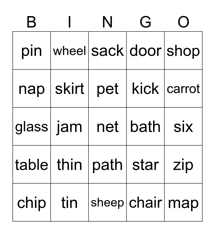 This bingo card has a free space and 24 words: thin, tin, pet, chip, shop, pin, nap, wheel, bath, path, kick, glass, star, zip, skirt, chair, six, sack, carrot, jam, map, table, door and sheep.