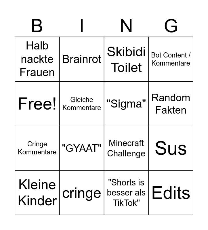 This bingo card has 16 words: cringe, Sus, Skibidi Toilet, Halb nackte Frauen, Cringe Kommentare, Brainrot, Minecraft Challenge, "Shorts is besser als TikTok", Free!, Gleiche Kommentare, Kleine Kinder, Bot Content / Kommentare, "GYAAT", Random Fakten, "Sigma" and Edits.
