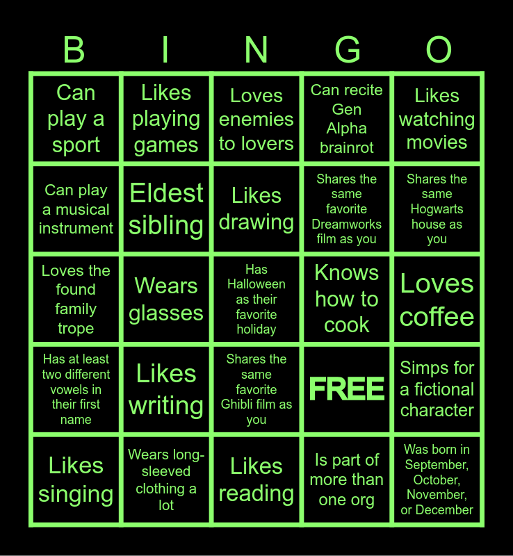 This bingo card has 25 words: Likes writing, Likes reading, Likes drawing, Likes singing, Likes watching movies, Can play a sport, Can play a musical instrument, Likes playing games, Knows how to cook, Shares the same favorite Ghibli film as you, Shares the same favorite Dreamworks film as you, Loves the found family trope, FREE, Simps for a fictional character, Eldest sibling, Was born in September, October, November, or December, Loves coffee, Loves enemies to lovers, Shares the same Hogwarts house as you, Wears glasses, Has Halloween as their favorite holiday, Wears long-sleeved clothing a lot, Has at least two different vowels in their first name, Can recite Gen Alpha brainrot and Is part of more than one org.