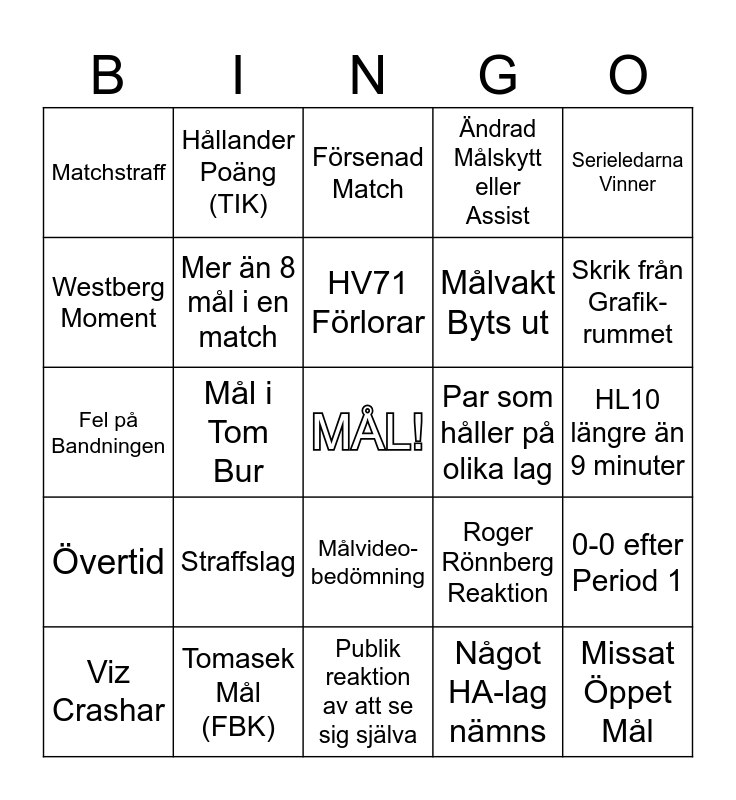This bingo card has a free space and 24 words: Straffslag, Tomasek Mål (FBK), HV71 Förlorar, Viz Crashar, Serieledarna Vinner, Matchstraff, Westberg Moment, Hållander Poäng (TIK), Par som håller på olika lag, Målvideo- bedömning, Målvakt Byts ut, Fel på Bandningen, Roger Rönnberg Reaktion, 0-0 efter Period 1, Mer än 8 mål i en match, Något HA-lag nämns, HL10 längre än 9 minuter, Försenad Match, Skrik från Grafik-rummet, Mål i Tom Bur, Missat Öppet Mål, Övertid, Ändrad Målskytt eller Assist and Publik reaktion av att se sig själva.