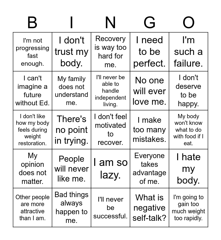 This bingo card has a free space and 31 words: I'll never be successful., I can't handle recovery., There's no point in trying., I'm so stupid., I'm not progressing fast enough., Recovery is way too hard for me., My family does not understand me., Everyone takes advantage of me., I make too many mistakes., What is negative self-talk?, My body won't know what to do with food if I eat., I'm going to gain too much weight too rapidly., Others are better than me., If I enjoy food, I'll go out of control when eating., I don't deserve to be happy., I don't know who I am., I hate my body., People will never like me., My opinion does not matter., I am so lazy., I'm such a failure., Everyone is against me., Other people are more attractive than I am., I don't trust my body., No one will ever love me., I can't imagine a future without Ed., I need to be perfect., I don't like how my body feels during weight restoration., Bad things always happen to me., I'll never be able to handle independent living. and I've ruined my body..