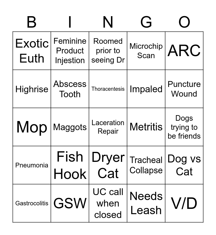 This bingo card has a free space and 24 words: Fish Hook, GSW, Thoracentesis, Gastrocolitis, ARC, Exotic Euth, Highrise, Feminine Product Injestion, Metritis, Dryer Cat, Impaled, Mop, Tracheal Collapse, Dog vs Cat, Abscess Tooth, Needs Leash, Dogs trying to be friends, Roomed prior to seeing Dr, Puncture Wound, Maggots, V/D, Pneumonia, Microchip Scan and UC call when closed.