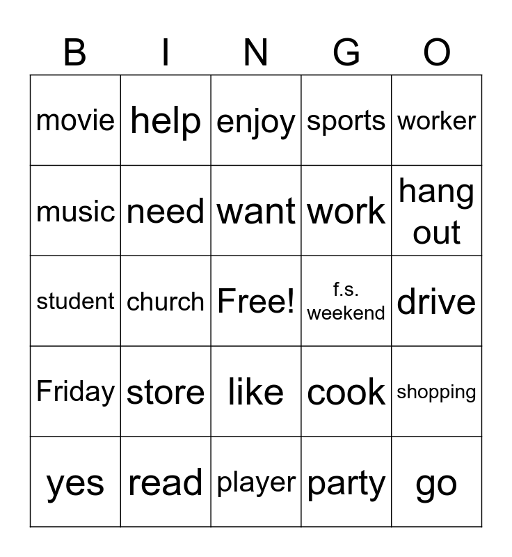 This bingo card has a free space and 24 words: store, read, want, yes, worker, movie, music, help, f.s. weekend, like, work, student, cook, shopping, need, party, drive, enjoy, hang out, church, go, Friday, sports and player.