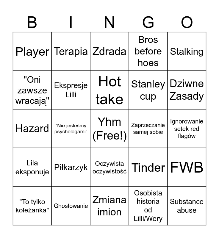 This bingo card has a free space and 24 words: Piłkarzyk, Ghostowanie, Hot take, "To tylko koleżanka", Stalking, Player, "Oni zawsze wracają", Terapia, Zaprzeczanie samej sobie, Oczywista oczywistość, Stanley cup, Hazard, Tinder, FWB, Ekspresje Lilli, Osobista historia od Lilli/Wery, Ignorowanie setek red flagów, Zdrada, Dziwne Zasady, "Nie jesteśmy psychologami", Substance abuse, Lila eksponuje, Bros before hoes and Zmiana imion.