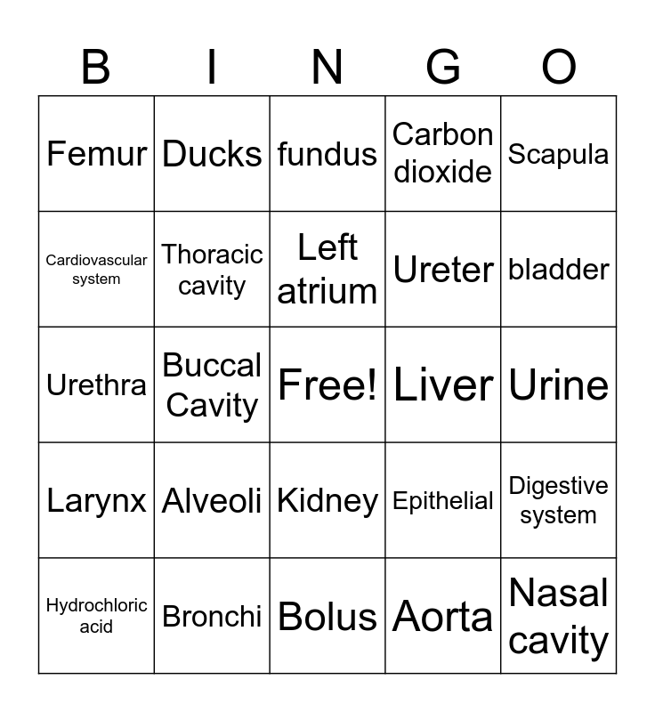 This bingo card has a free space and 24 words: Alveoli, Bronchi, Left atrium, Hydrochloric acid, Scapula, Femur, Cardiovascular system, Ducks, Liver, Kidney, Ureter, Urethra, Epithelial, Digestive system, Thoracic cavity, Aorta, Urine, fundus, bladder, Buccal Cavity, Nasal cavity, Larynx, Carbon dioxide and Bolus.