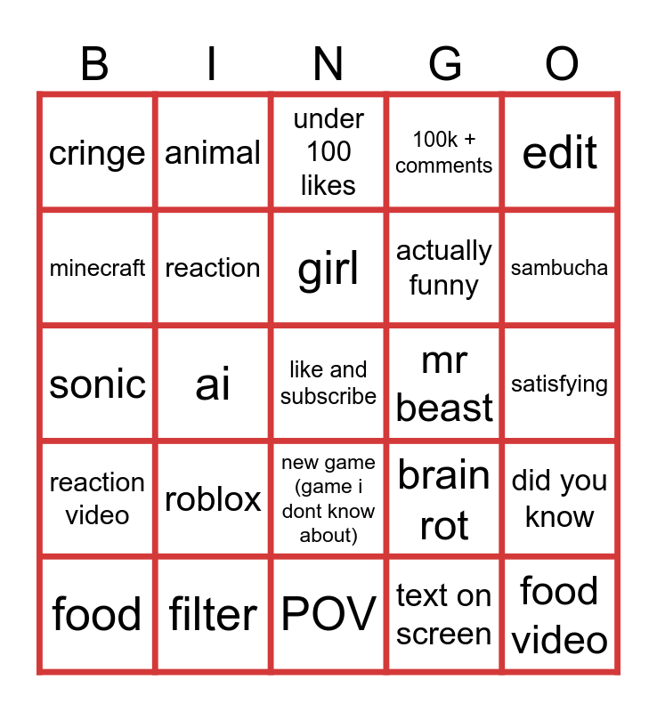 This bingo card has 25 words: reaction video, filter, like and subscribe, text on screen, edit, cringe, animal, under 100 likes, mr beast, did you know, minecraft, reaction, POV, brain rot, sambucha, food, ai, girl, actually funny, satisfying, sonic, roblox, new game (game i dont know about), 100k + comments and food video.