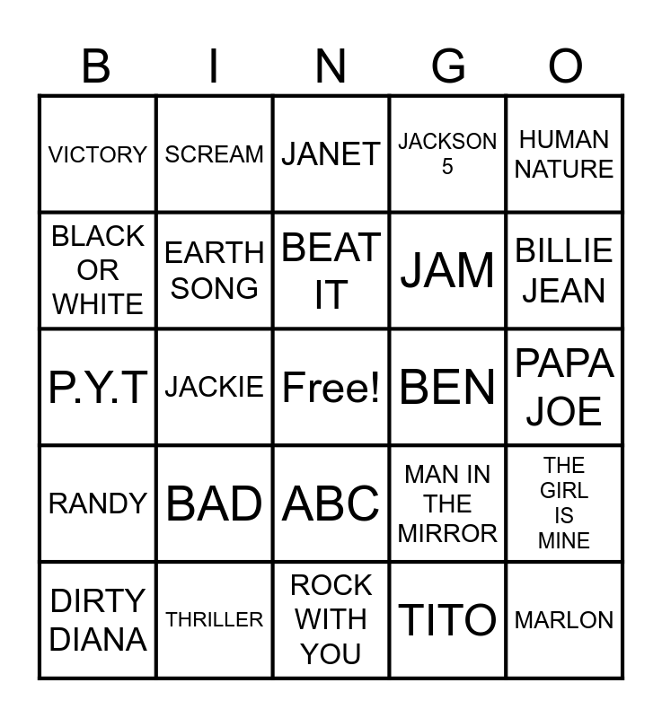 This bingo card has a free space and 24 words: BAD, THRILLER, BEAT IT, DIRTY DIANA, HUMAN NATURE, VICTORY, BLACK OR WHITE, SCREAM, BEN, ABC, JAM, P.Y.T, MAN IN THE MIRROR, THE GIRL IS MINE, EARTH SONG, TITO, PAPA JOE, JANET, BILLIE JEAN, JACKIE, MARLON, RANDY, JACKSON 5 and ROCK WITH YOU.