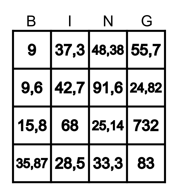 This bingo card has 16 words: 28,5, 732, 48,38, 9, 15,8, 37,3, 25,14, 33,3, 9,6, 42,7, 35,87, 55,7, 68, 24,82, 91,6 and 83.