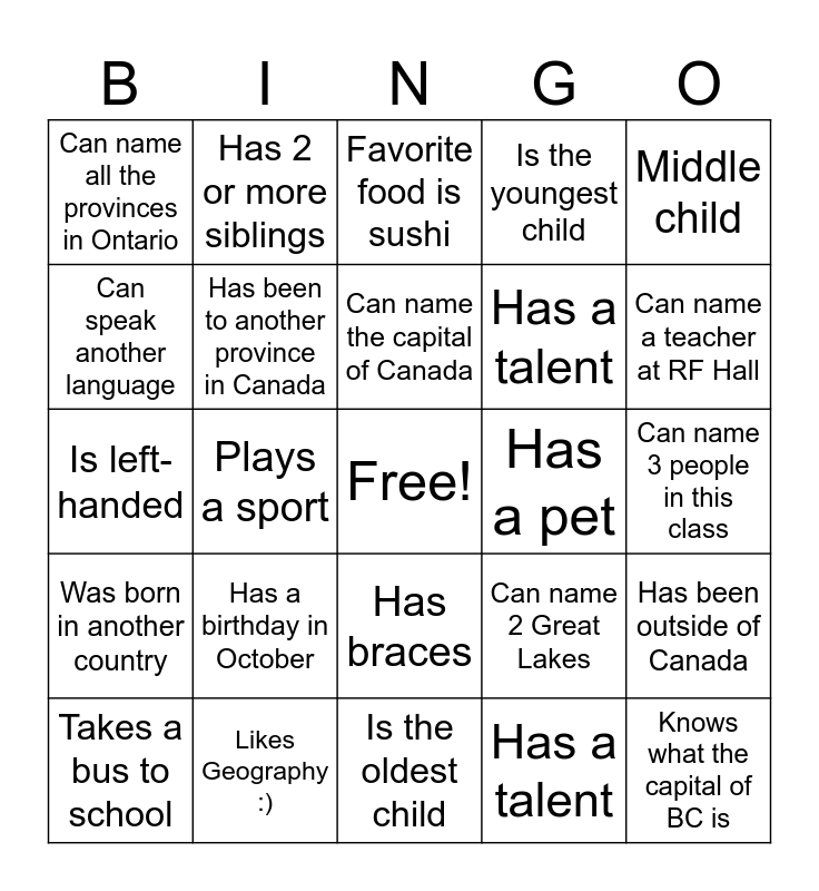 This bingo card has a free space and 24 words: Has a birthday in October, Likes Geography :), Can name the capital of Canada, Takes a bus to school, Middle child, Can name all the provinces in Ontario, Can speak another language, Has 2 or more siblings, Has a pet, Has braces, Has a talent, Is left-handed, Can name 2 Great Lakes, Has been outside of Canada, Has been to another province in Canada, Has a talent, Can name 3 people in this class, Favorite food is sushi, Can name a teacher at RF Hall, Plays a sport, Knows what the capital of BC is, Was born in another country, Is the youngest child and Is the oldest child.