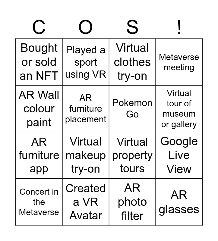 This bingo card has 16 words: Created a VR Avatar, Google Live View, Virtual clothes try-on, Bought or sold an NFT, AR furniture app, Played a sport using VR, Virtual property tours, AR photo filter, AR Wall colour paint, AR furniture placement, Concert in the Metaverse, Metaverse meeting, Virtual makeup try-on, Virtual tour of museum or gallery, Pokemon Go and AR glasses.