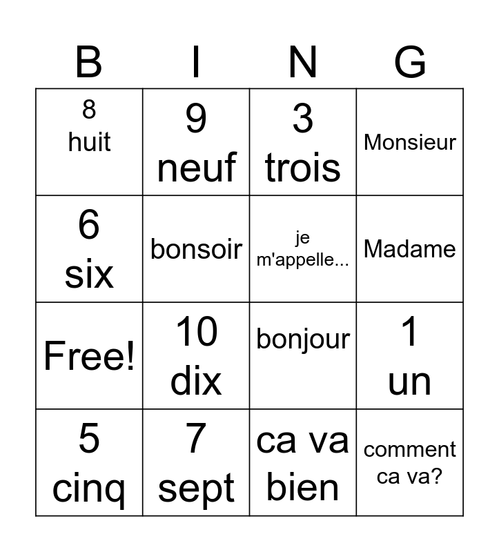 This bingo card has 20 words: 1 un, 2 deux, 3 trois, 4 quatre, 5 cinq, 6 six, 7 sept, 8 huit, Free!, 9 neuf, 10 dix, bonjour, bonsoir, comment ca va?, je m'appelle..., tres bien, Madame, Monsieur, ca va bien and ca va mal.