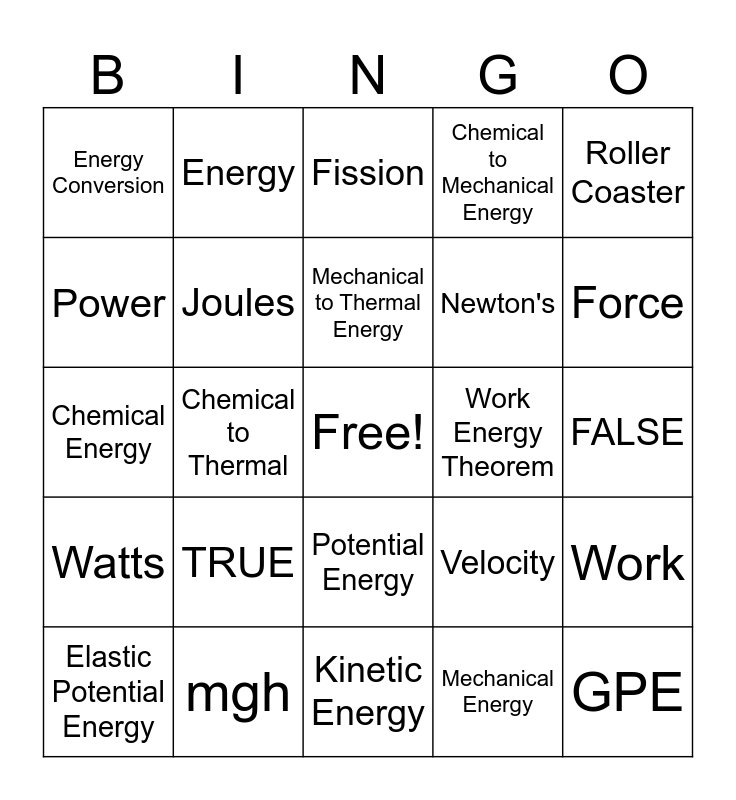 This bingo card has a free space and 24 words: TRUE, mgh, Mechanical to Thermal Energy, Elastic Potential Energy, Roller Coaster, Energy Conversion, Power, Energy, Work Energy Theorem, Potential Energy, Newton's, Chemical Energy, Velocity, Work, Joules, Mechanical Energy, FALSE, Fission, Force, Chemical to Thermal, GPE, Watts, Chemical to Mechanical Energy and Kinetic Energy.