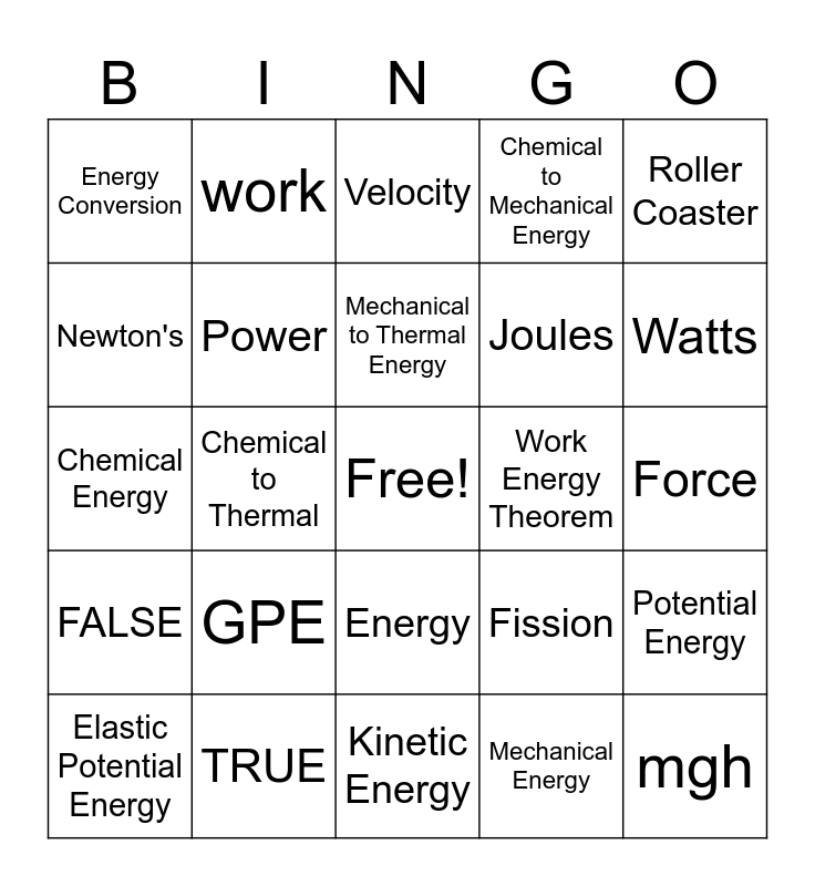 This bingo card has a free space and 24 words: GPE, TRUE, Mechanical to Thermal Energy, Elastic Potential Energy, Roller Coaster, Energy Conversion, Newton's, work, Work Energy Theorem, Energy, Joules, Chemical Energy, Fission, Potential Energy, Power, Mechanical Energy, Force, Velocity, Watts, Chemical to Thermal, mgh, FALSE, Chemical to Mechanical Energy and Kinetic Energy.