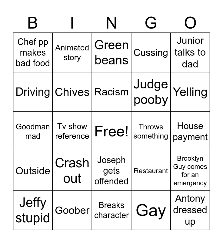 This bingo card has a free space and 24 words: Jeffy stupid, Crash out, Racism, Gay, Junior talks to dad, Chef pp makes bad food, Animated story, Green beans, Throws something, House payment, Goodman mad, Chives, Restaurant, Brooklyn Guy comes for an emergency, Driving, Goober, Breaks character, Cussing, Yelling, Outside, Tv show reference, Joseph gets offended, Judge pooby and Antony dressed up.