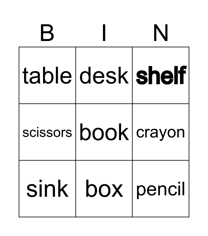 This bingo card has 12 words: chair, pencil, book, crayon, desk, shelf, box, counter, table, scissors, sink and stool.