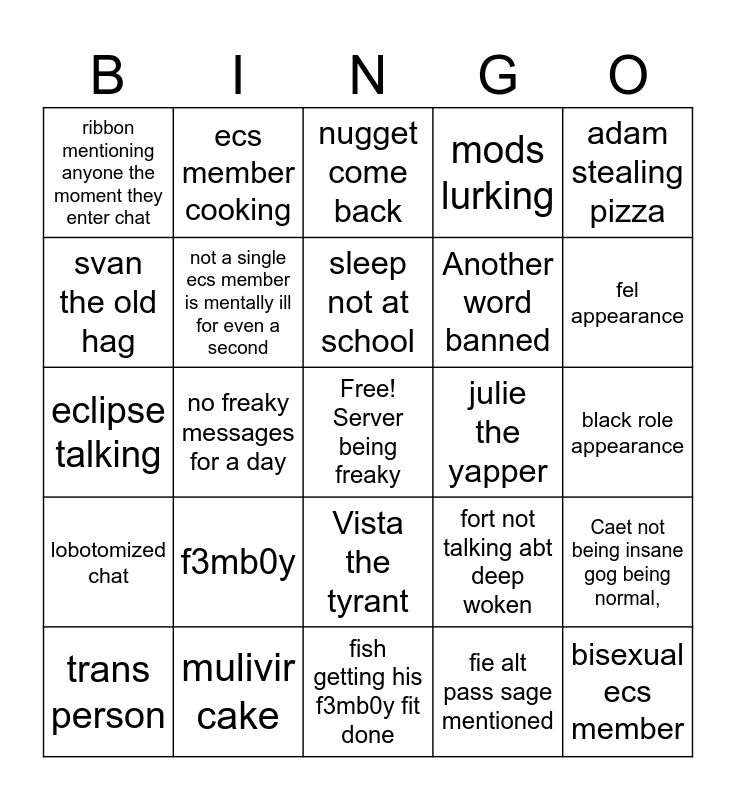 This bingo card has a free space and 24 words: f3mb0y, mulivir cake, sleep not at school, trans person, adam stealing pizza, ribbon mentioning anyone the moment they enter chat, svan the old hag, ecs member cooking, julie the yapper, Vista the tyrant, Another word banned, eclipse talking, fort not talking abt deep woken, Caet not being insane gog being normal,, not a single ecs member is mentally ill for even a second, fie alt pass sage mentioned, black role appearance, nugget come back, fel appearance, no freaky messages for a day, bisexual ecs member, lobotomized chat, mods lurking and fish getting his f3mb0y fit done.