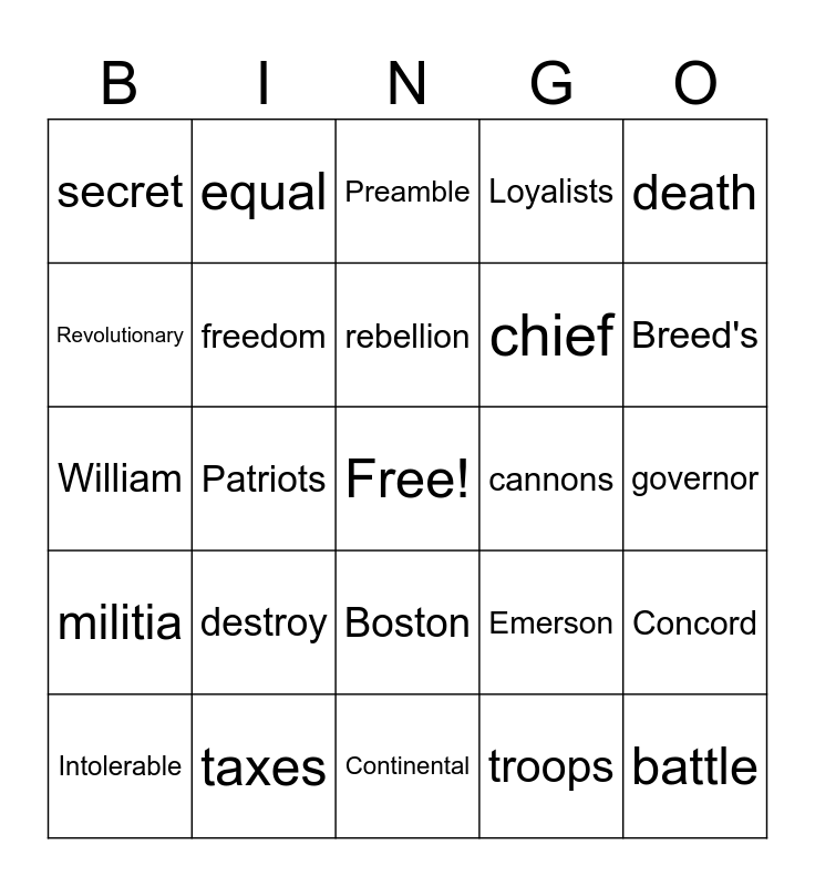 This bingo card has a free space and 39 words: government, Philadelphia, representatives, freedom, Intolerable, Boston, rebellion, Burgesses, death, militia, Patriots, Loyalists, battle, governor, cannons, destroy, Paul Revere, secret, shot, Emerson, Revolutionary, Continental, chief, Breed's, ammunition, independence, Paine, Sense, Jefferson, equal, liberty, happiness, Preamble, taxes, troops, Virginia, Concord, William and president.