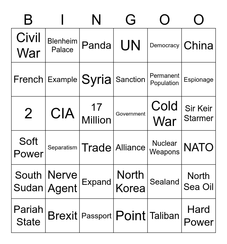This bingo card has 36 words: North Korea, Expand, Point, French, Soft Power, Government, Example, Passport, Democracy, Sealand, Espionage, UN, North Sea Oil, CIA, Sanction, Civil War, South Sudan, Cold War, 2, Panda, 17 Million, Separatism, Alliance, Trade, Nuclear Weapons, Blenheim Palace, Permanent Population, Brexit, Syria, China, Hard Power, Pariah State, NATO, Sir Keir Starmer, Nerve Agent and Taliban.
