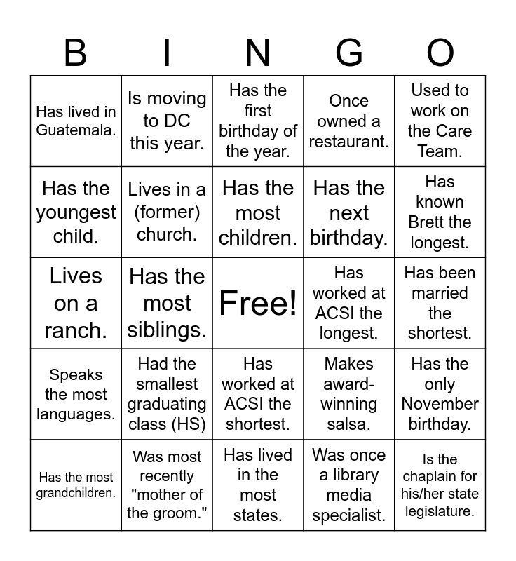 This bingo card has a free space and 25 words: Had the smallest graduating class (HS), Has lived in the most states., Has the most children., Has the most grandchildren., Used to work on the Care Team., Has lived in Guatemala., Has the youngest child., Is moving to DC this year., Has worked at ACSI the longest., Has worked at ACSI the shortest., Has the next birthday., Lives on a ranch., Makes award-winning salsa., Has the only November birthday., Lives in a (former) church., Has been married the longest., Has been married the shortest., Has the first birthday of the year., Has known Brett the longest., Has the most siblings., Is the chaplain for his/her state legislature., Was most recently "mother of the groom.", Speaks the most languages., Once owned a restaurant. and Was once a library media specialist..