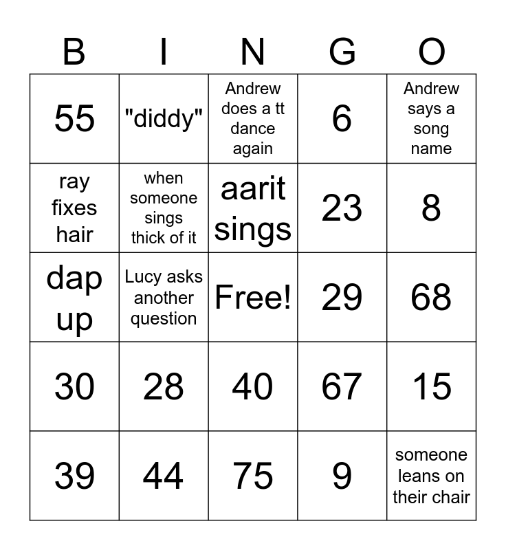 This bingo card has a free space and 75 words: Bernard says brain rot, aarit says yesbro or come-on man, Andrew does a tt dance again, Lucy gets mad at us, ray says erer or fein, Jacob makes another joke, Daniel talks to himself, James dances bye bye bye, Jason rants about smart stuff, Arjun makes weird hand movements, Korey types a whole essay, Olivia draws a masterpiece, aarit sings, ray fixes hair, Kenson steals stuff, Lucy asks another question, aarit says something racist, someone leans on their chair, Jason argues w another person, Andrew says a song name, someone talks back to the teacher, dap up, when someone sings thick of it, "diddy", 6, 21, 35, 51, 66, 7, 22, 36, 52, 67, 8, 23, 37, 53, 68, 9, 24, 38, 54, 69, 10, 25, 39, 55, 70, 11, 26, 40, 56, 71, 12, 27, 41, 57, 72, 13, 28, 42, 58, 73, 14, 29, 43, 59, 74, 15, 30, 44, 60, 75 and 45.