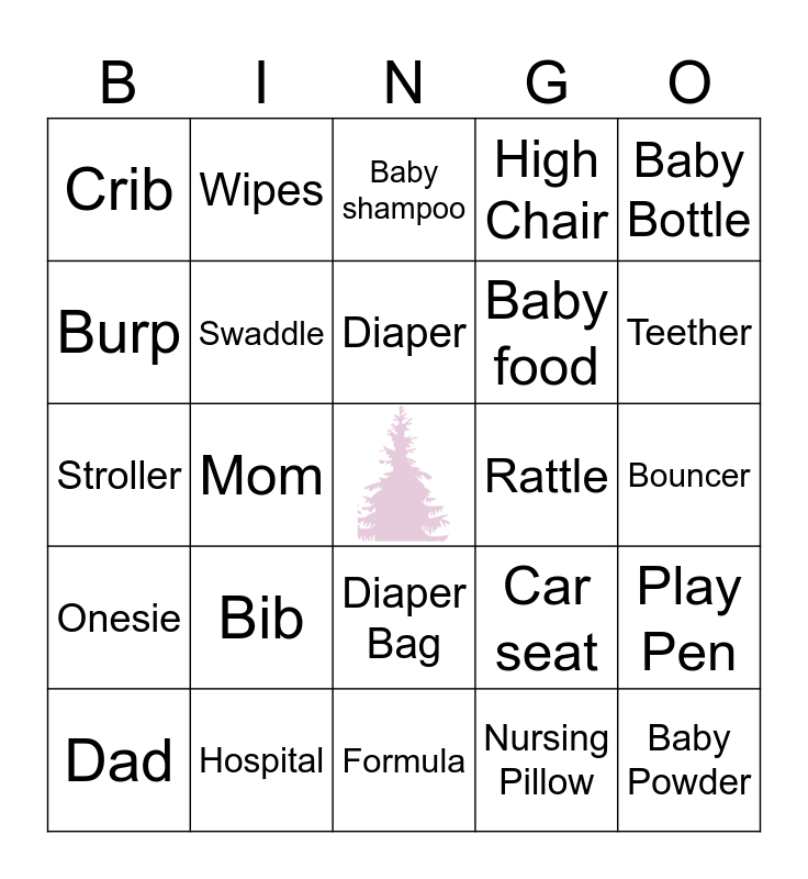 This bingo card has a free space and 24 words: Bib, Hospital, Diaper, Dad, Baby Bottle, Crib, Burp, Wipes, Rattle, Diaper Bag, Baby food, Stroller, Car seat, Play Pen, Swaddle, Nursing Pillow, Bouncer, Baby shampoo, Teether, Mom, Baby Powder, Onesie, High Chair and Formula.