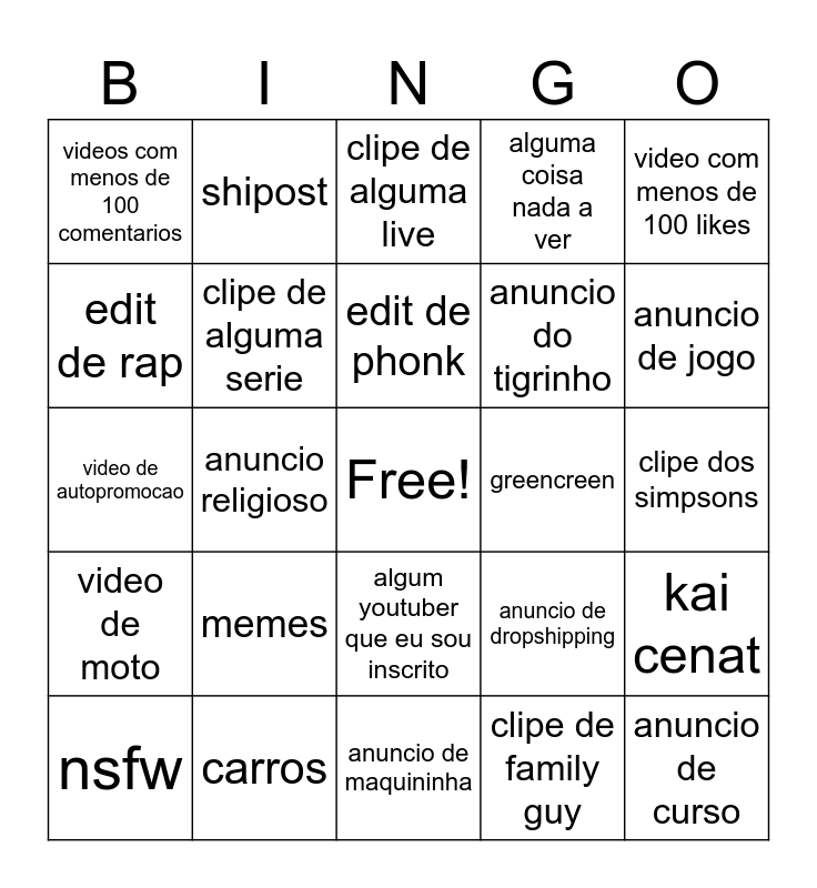 This bingo card has a free space and 24 words: memes, carros, edit de phonk, nsfw, video com menos de 100 likes, videos com menos de 100 comentarios, edit de rap, shipost, greencreen, algum youtuber que eu sou inscrito, anuncio do tigrinho, video de autopromocao, anuncio de dropshipping, kai cenat, clipe de alguma serie, clipe de family guy, clipe dos simpsons, clipe de alguma live, anuncio de jogo, anuncio religioso, anuncio de curso, video de moto, alguma coisa nada a ver and anuncio de maquininha.