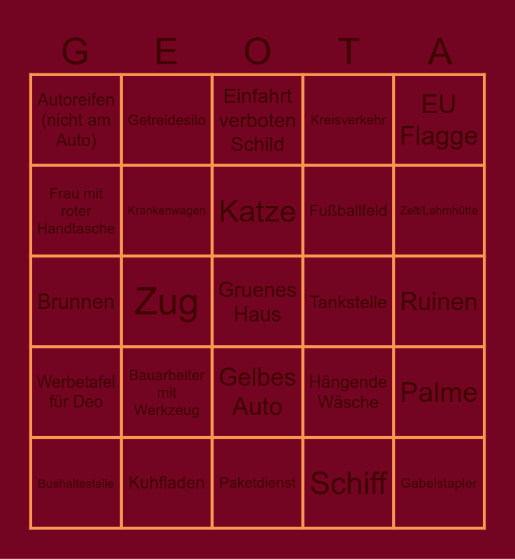 This bingo card has 86 words: Free!, Waschmaschine, Gelbes Auto, Rennende Frau, Stadtbus, Kaktus, Tunnel, Graffiti (nicht Schmiererei), Google Auto (Spiegelung), Bahnübergang, Kuh, Traktor, Palme, Ruinen, Denkmal/Statue, Katze, Burgerladen, Bauer mit Werkzeug, Friedhof, Wildes Tier (Kein Vogel), Ozean, Geldautomat, Brunnen, 5+ Fahrradfahrer, Schiff, Brücke, Hund, Briefkasten, Hydrant, Tempel/Kirche, Kuhfladen, Kran, Baufahrzeug, Bauarbeiter mit Werkzeug, Frau mit roter Handtasche, Dönerladen, Zelt/Lehmhütte, Polizeiauto, Feuerwehrauto, Zug, Garage, MC Donalds, Schnee (nicht Berg), Tankstelle, Straßenbahn, EU Flagge, Weißes Dach, Getreidesilo, Windrad, Schule, LKW mit Tank, Balkonblumen, Werbetafel für Deo, Abfalltonnen, Baugerüst, Rotes Motorrad, Wellblech Haus, Fußballfeld, Kreisverkehr, Krankenwagen, Autoreifen (nicht am Auto), eingeschlagene Fensterscheibe, Grill, Teich, toter Baum, Einfahrt verboten Schild, Park, Gruenes Haus, Gabelstapler, Tankstelle, Klimaanlage, Mensch mit Handy in der Hand, Bushaltestelle, Einkaufswagen, Spielplatz, Vogelhäusschen, Paketdienst, Zebrastreifen, Hochsitz, Taxi, Autohändler, Vogel, Schrein, Basketballplatz, Hängende Wäsche and Wasserturm.